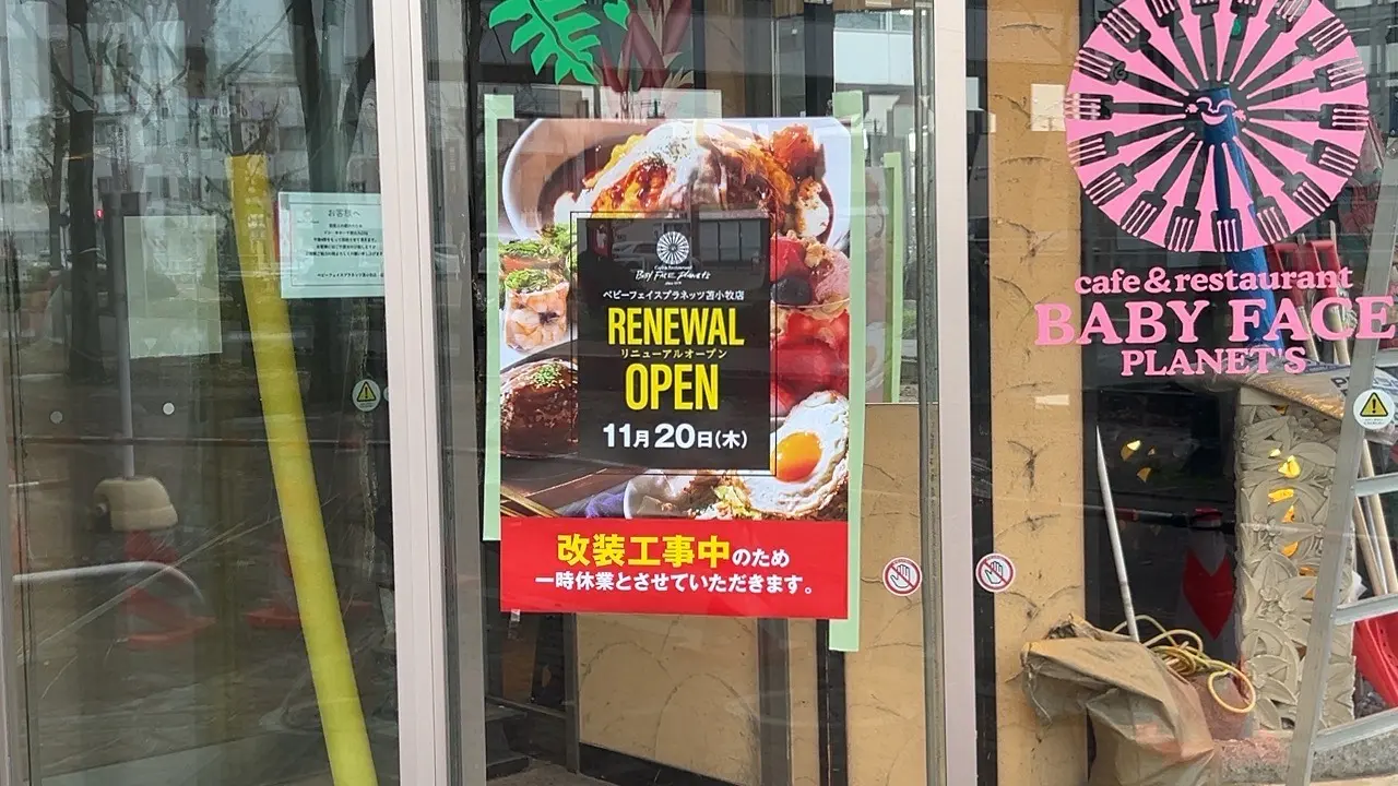 木場町のMEGAドン・キホーテ苫小牧店にあるレストラン「ベビーフェイスプラネッツ苫小牧店」が改装工事中のため一時休業中とのことです!