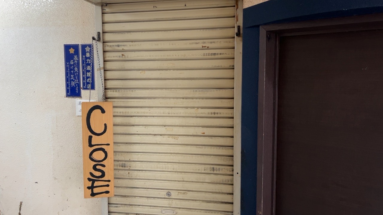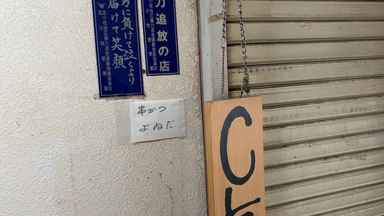 こちらが元「串カツ たッかちゃん」の場所です。CLOSEの札があってシャッターも閉まっています。