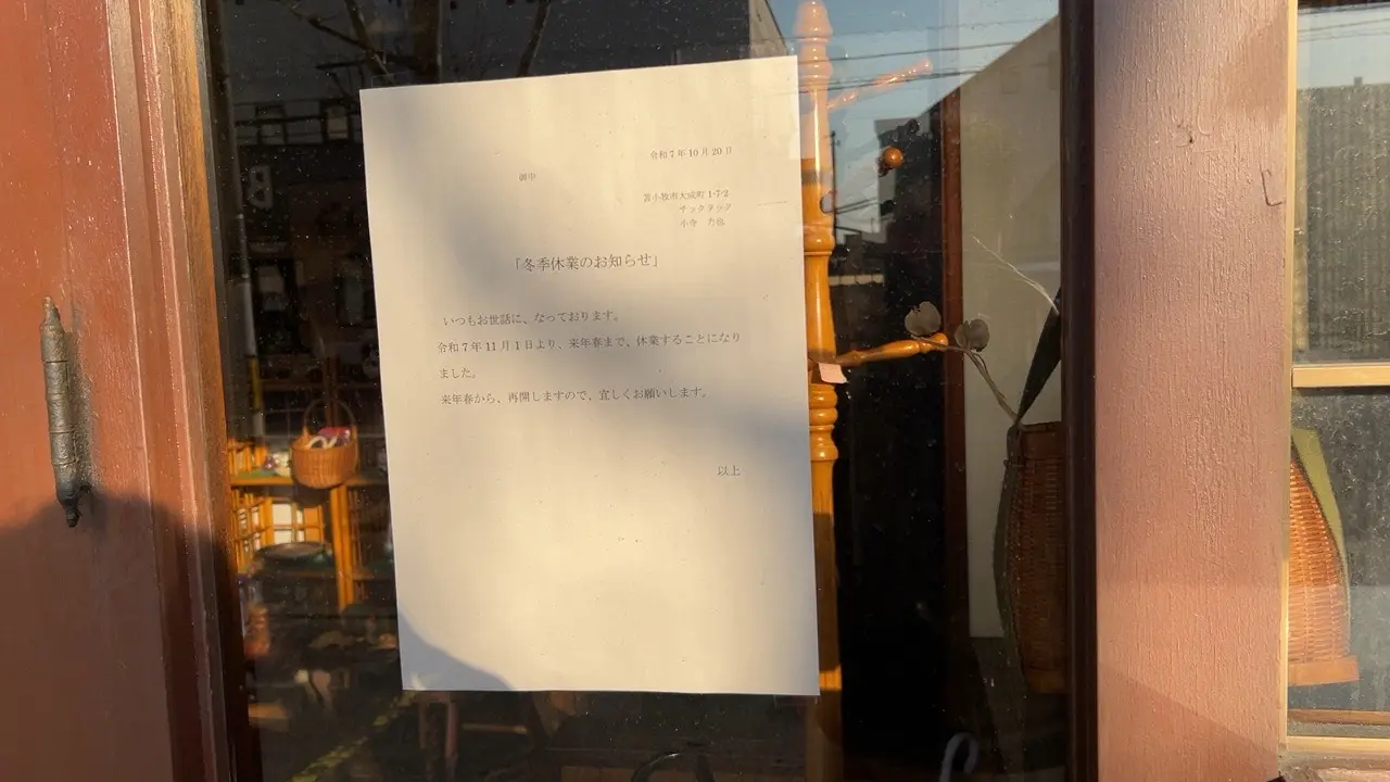 冬季休業のお知らせと題した貼り紙が店前に貼ってありました。「2025年11月1日より、来年春まで、休業することになりました。来年春から、再開しますのでよろしくお願いします」と記載がありました。