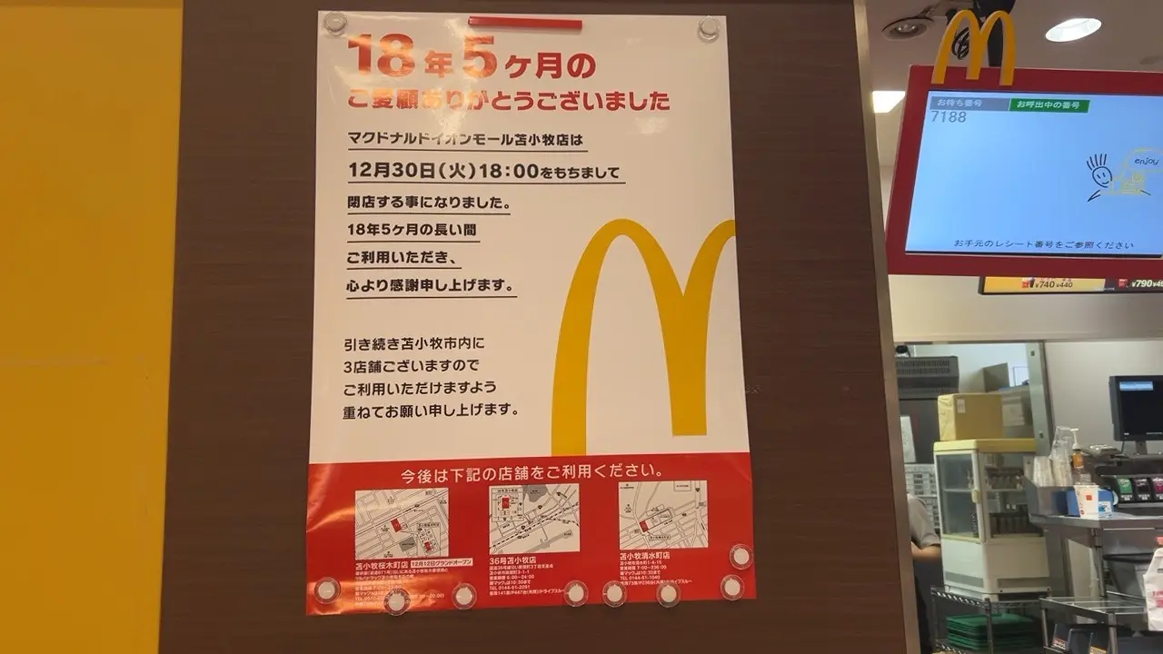 18年5ヶ月のご愛顧ありがとうございましたと題し、「マクドナルドイオンモール苫小牧店は12月30日(火)18時をもちまして閉店する事になりました」という記載がありました。