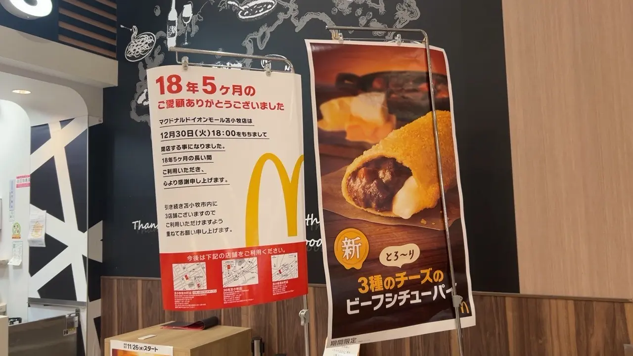 柳町のイオンモール苫小牧内にある「マクドナルドイオンモール苫小牧店」が2025年12月30日で閉店することになりました。