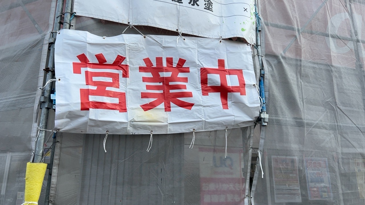 足場で囲まれた店舗の様子です。すっぽりと囲まれており、何か工事中のようです。