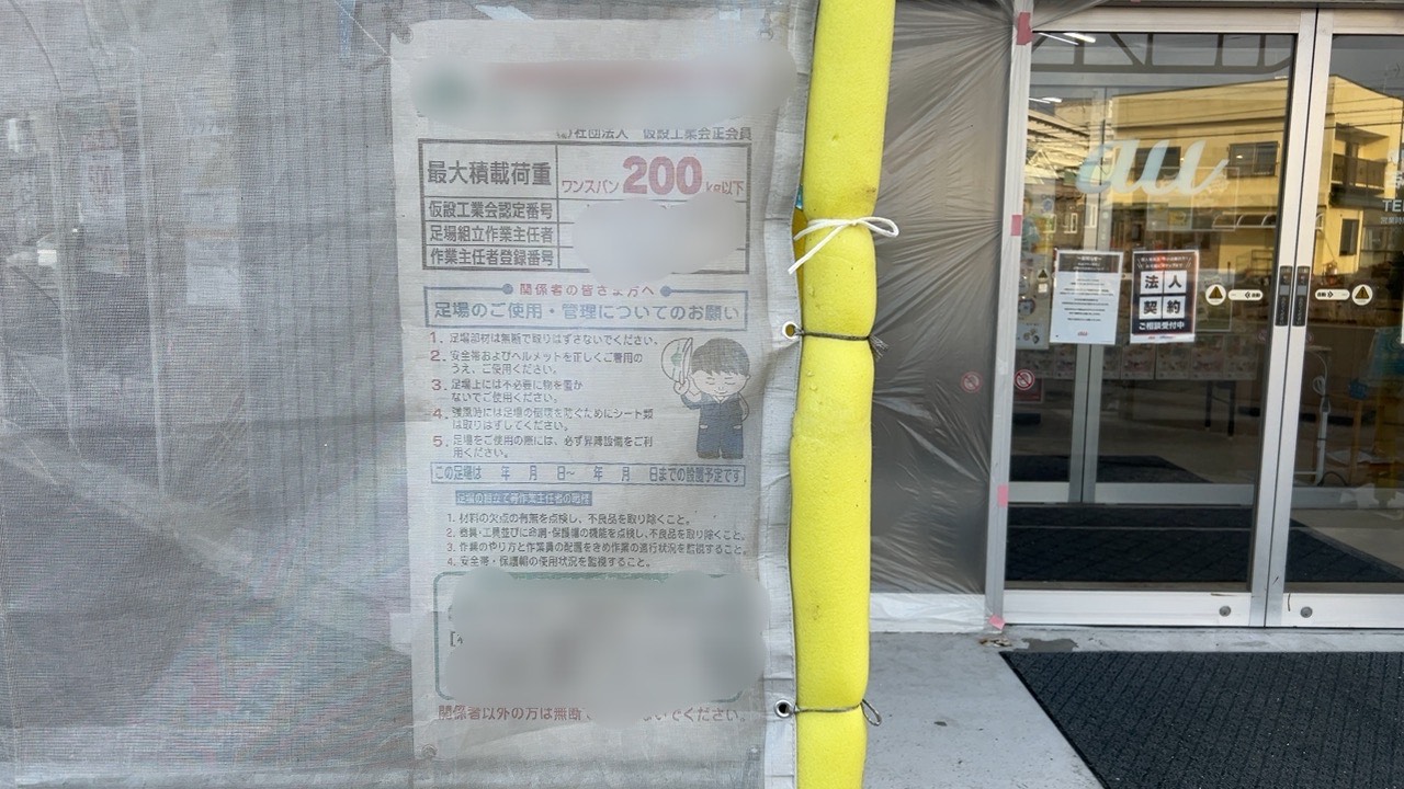 標識のようなものも確認できましたが、期間や目的は確認できませんでした。モザイクになっているところは足場レンタル業者の名前が記されていました。