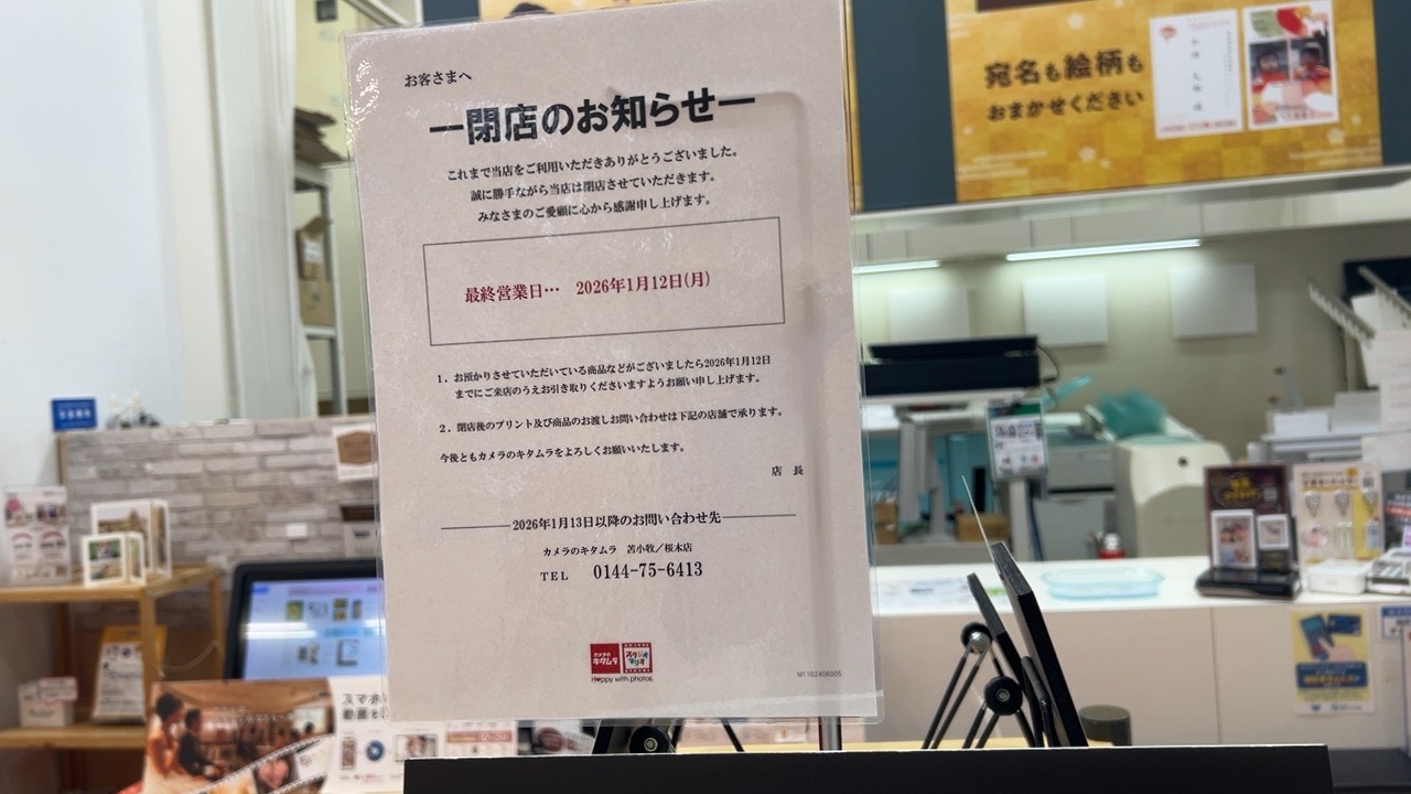 柳町のイオンモール苫小牧の1階にある「カメラのキタムラ 苫小牧・イオンモール苫小牧店」が2026年1月12日に閉店するそうです。