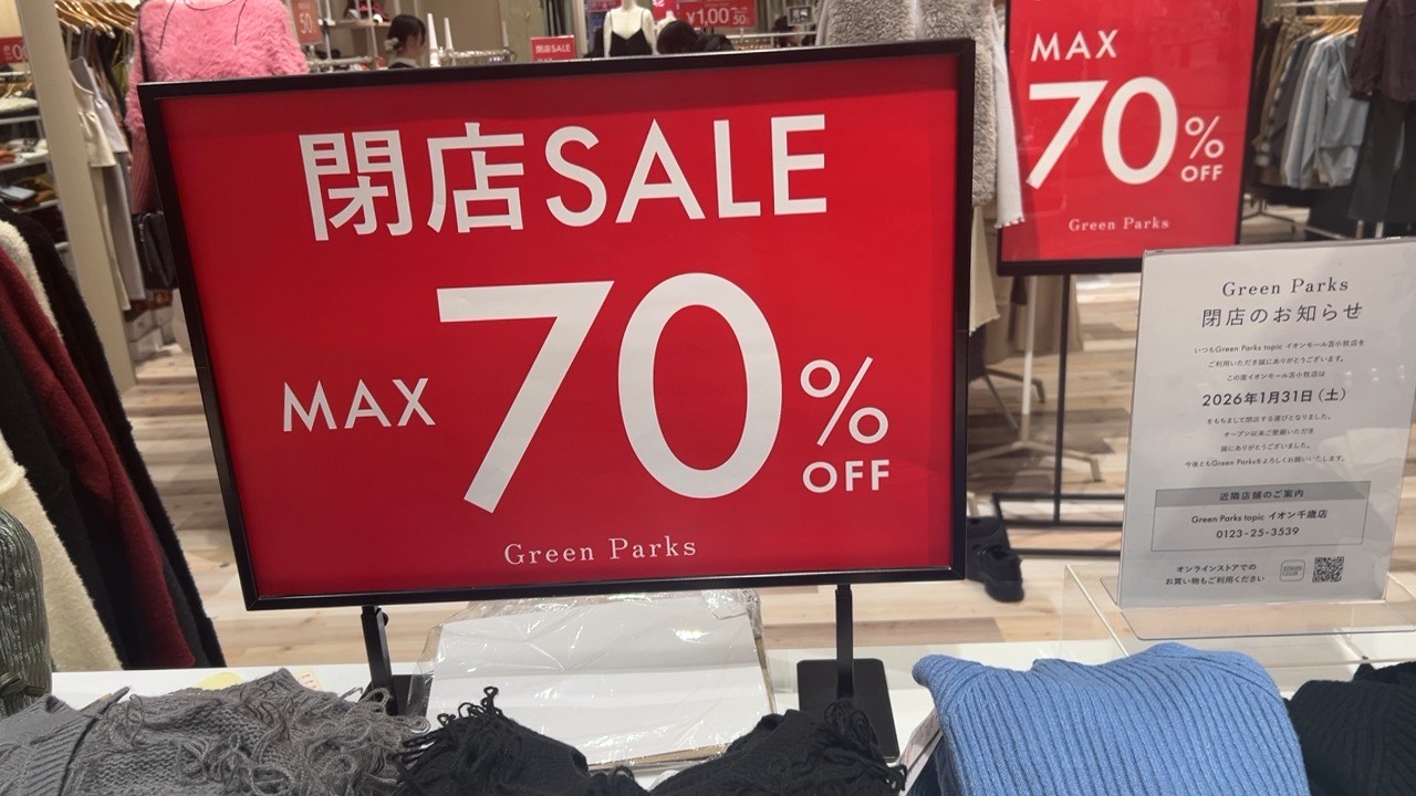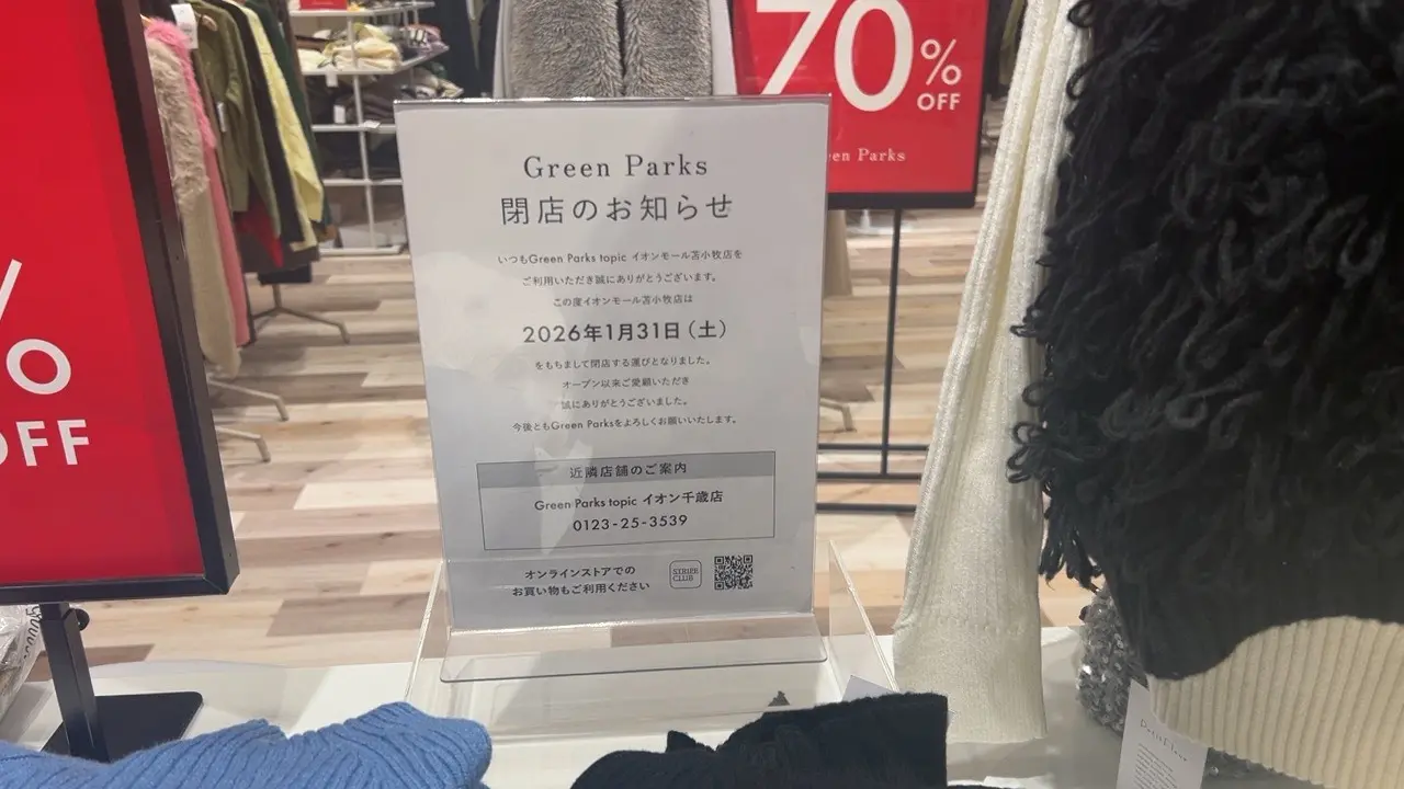 柳町のイオンモール苫小牧1階にある「Green Parks topic」が、2026年1月31日(土)に閉店することになりました。