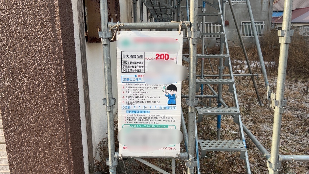 周辺を見回してみると標識のようなものも確認できましたが、期間や目的は確認できませんでした。モザイクになっているところは足場レンタル業者の名前が記されていました。