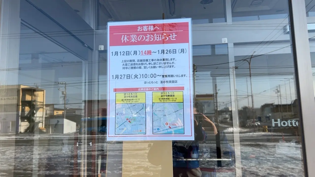 張り紙には「お客様へ休業のお知らせ」とあり、2025年1月12日(月)14時から1月26日(月)まで、店舗設備工事のため休業と記載されています。休業期間中の近隣店舗として、苫小牧末広店と苫小牧新富店が案内されていました。