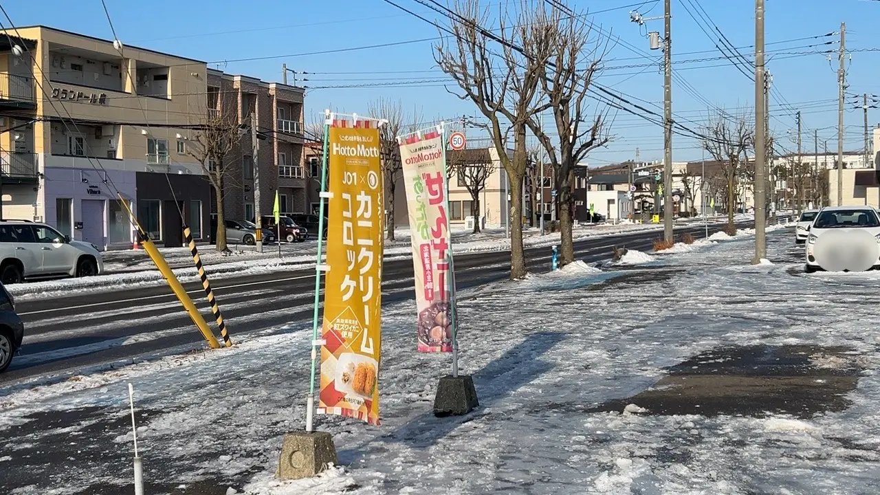 2026年に新発売した、カニクリームコロッケとあったかぜんざいののぼり旗もまだある様子でした。