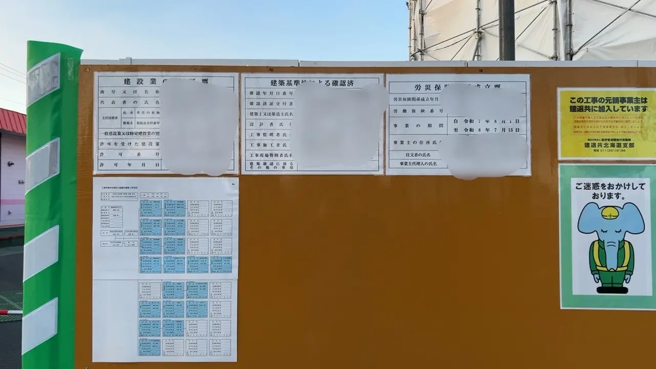 敷地内には、工事の目的や期間が記された標識も設置されており、工事期間は2025年8月1日から2026年7月15日までと記載されていました。