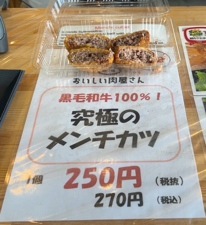 もう一つのおすすめは「究極のメンチカツ」(税込み270円)。こちらも黒毛和牛を使用しており、肉の旨みをしっかりと味わえる満足感のある一品です。どちらも揚げたてはもちろん、冷めても美味しくいただけるのでテイクアウトにもぴったり。夕飯のおかずや、もう一品欲しいときにも重宝しそうです。