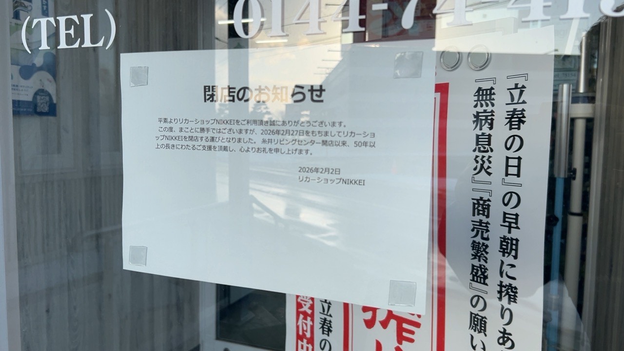 店前には閉店のお知らせと題した貼り紙があり、「この度、まことに勝手ではございますが、2026年2月27日をもちましてリカーショップNIKKEIを閉店する運びとなりました」とありました。