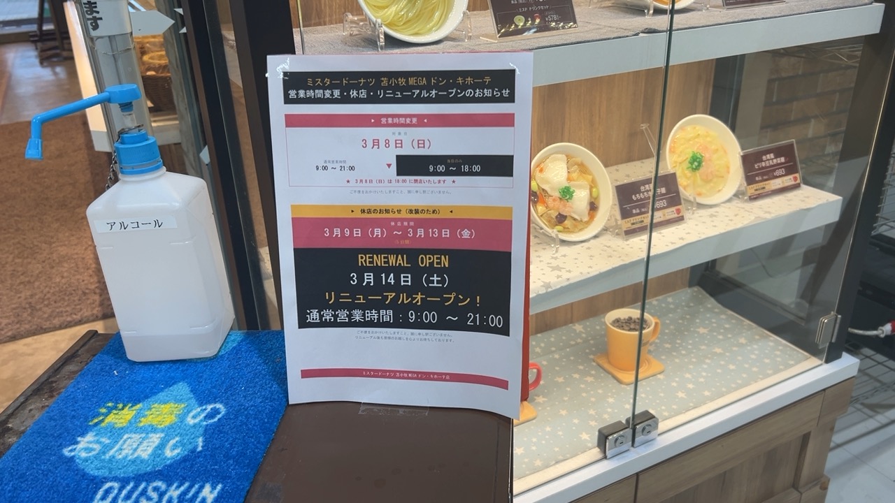 「ミスタードーナツ 苫小牧MEGAドン・キホーテショップ」がリニューアルすることがわかりました。