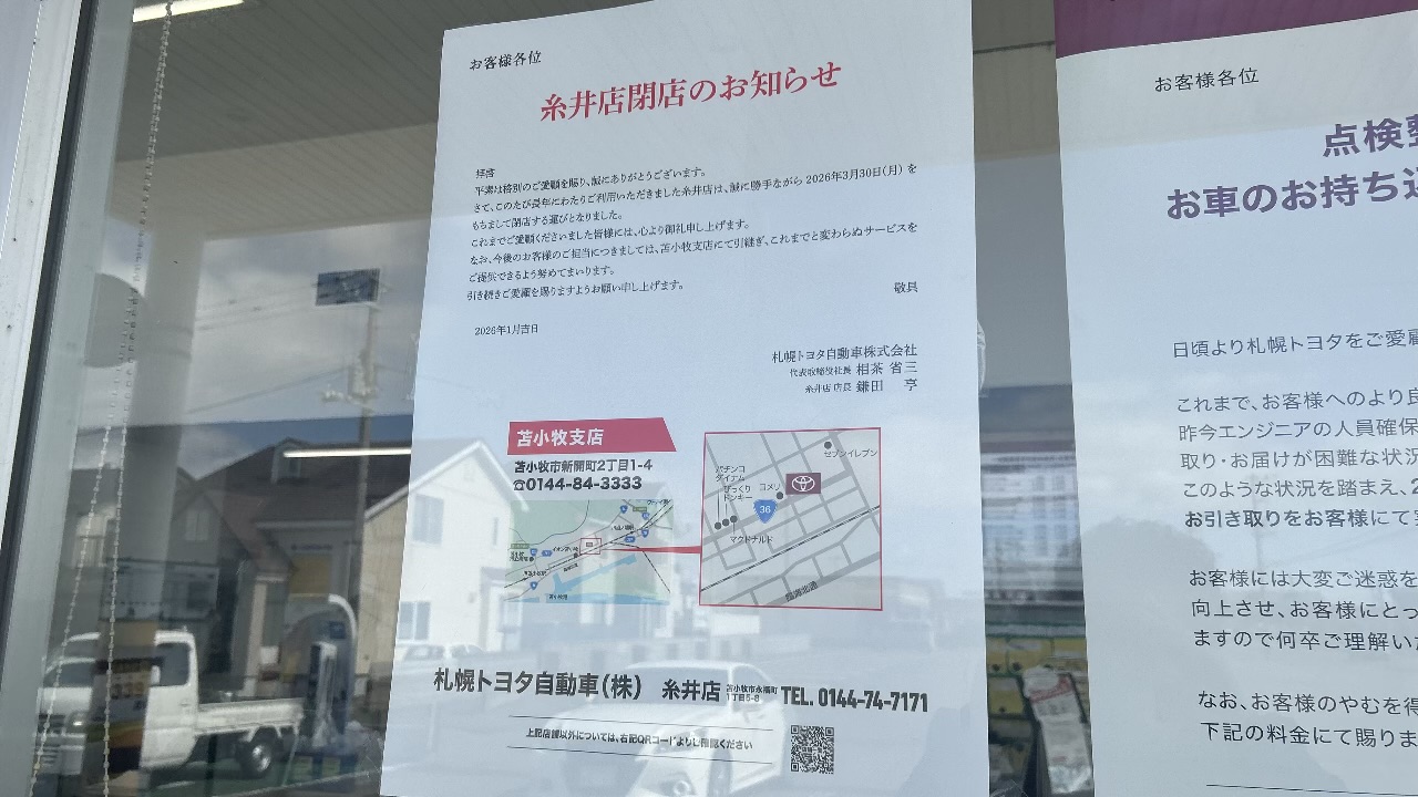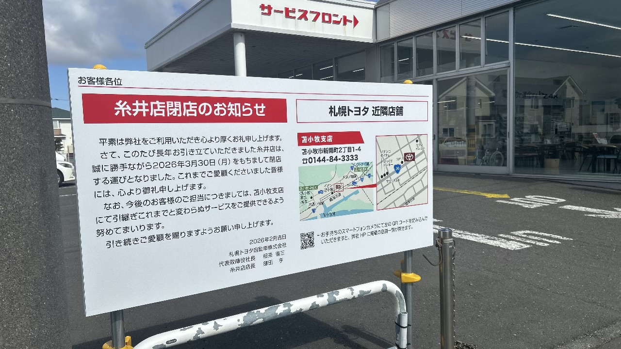 【苫小牧市】永福町の国道36号沿いにある「札幌トヨタ自動車 糸井店」が3月30日で閉店へ。店頭にもお知らせが掲示されています。