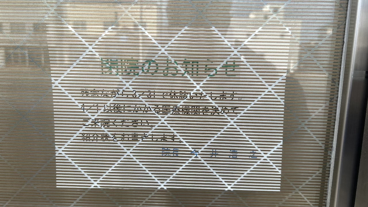 双葉町1丁目にある「いまい内科クリニック」が2026年3月31日に閉院することがわかりました。現地を訪れてみると、入口のドアに「閉院のお知らせ」と題した貼り紙が掲示されていました。
