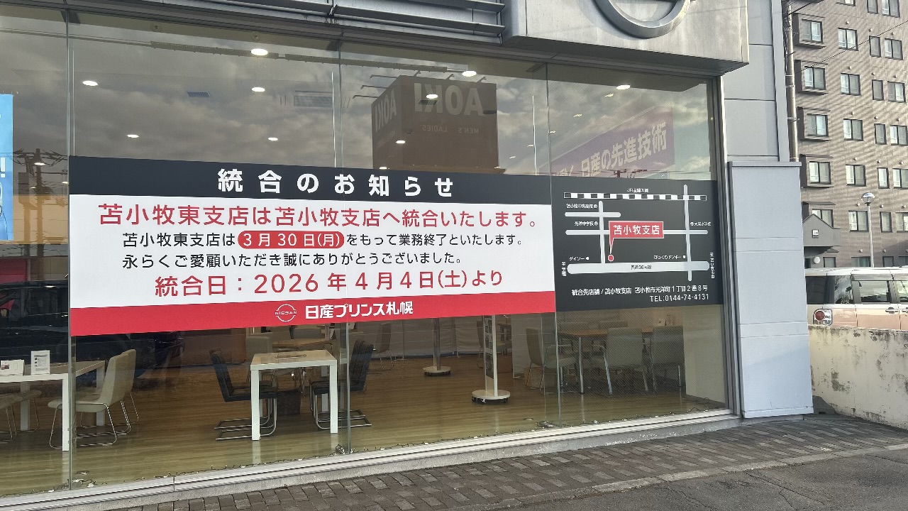 柳町4丁目、国道36号線沿いにある「日産プリンス札幌 苫小牧東支店」が営業を終了し、本日2026年4月4日(土)から光洋町の「苫小牧支店」へ統合されることがわかりました。