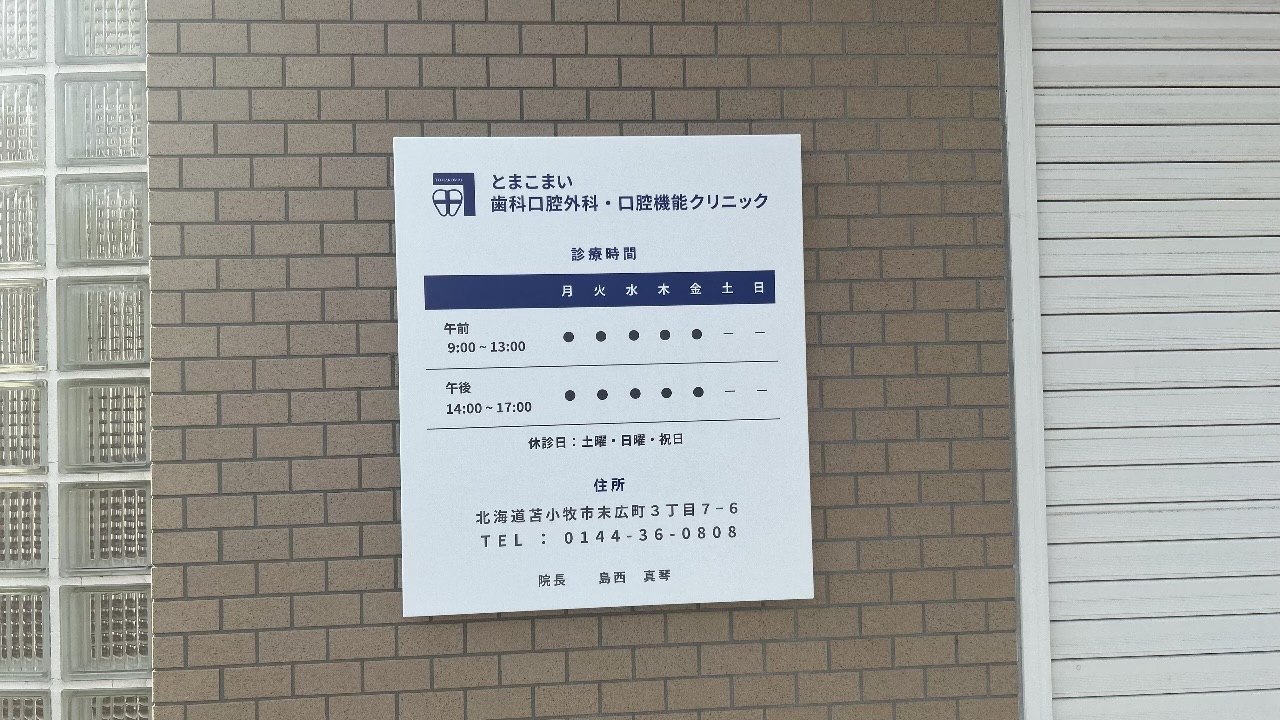 その後、約1か月ほどで看板が新しく張り替えられ、「とまこまい歯科口腔外科・口腔機能クリニック」の名称が掲げられていました。ホームページでは具体的な開院日の記載は確認できませんでしたが、関係者によると2026年4月1日に開院したとのことです。