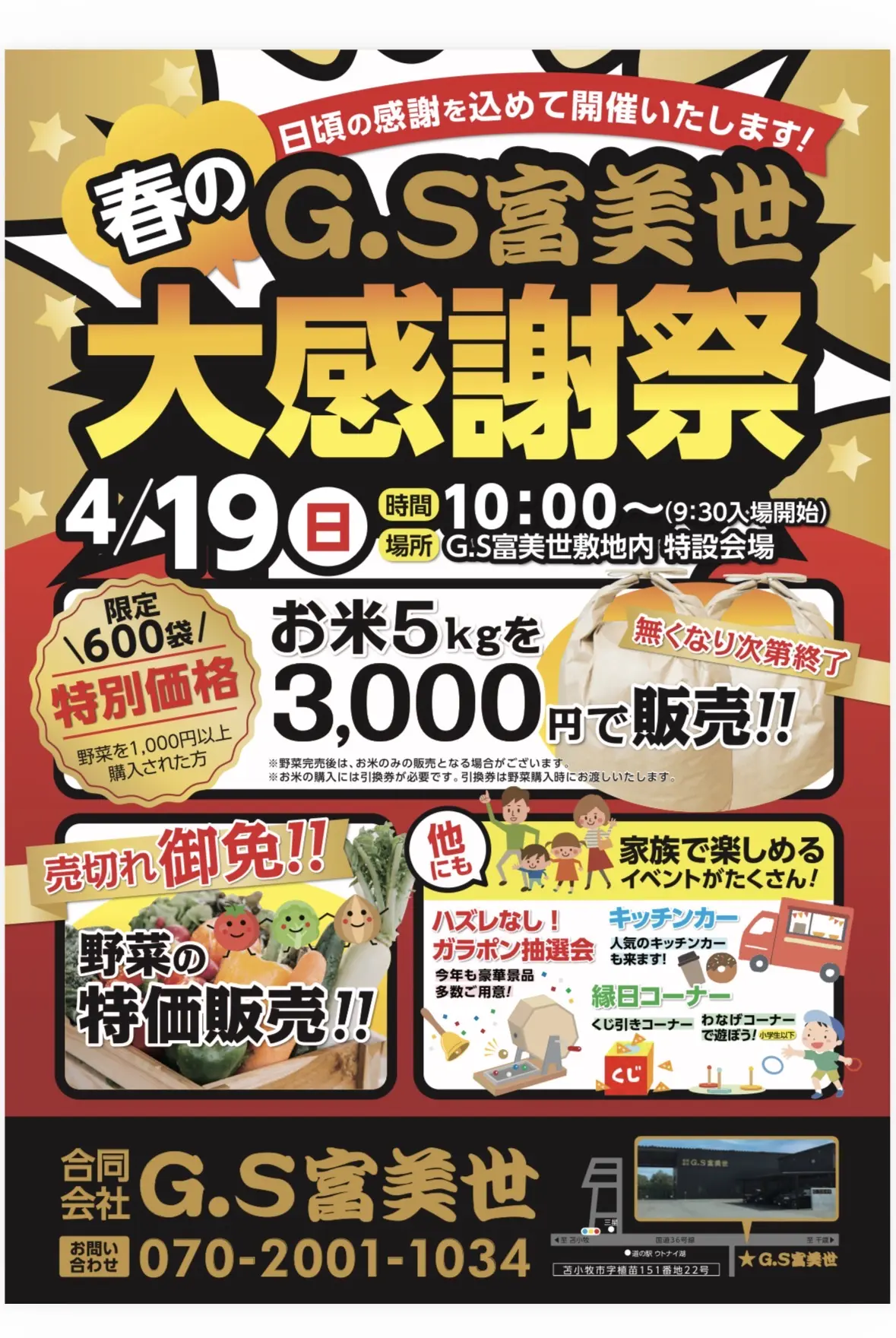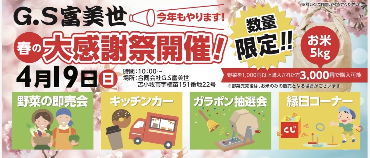 2026年4月19日(日)に植苗の合同会社G.S富美世で今年も春の大感謝祭が開催されます!