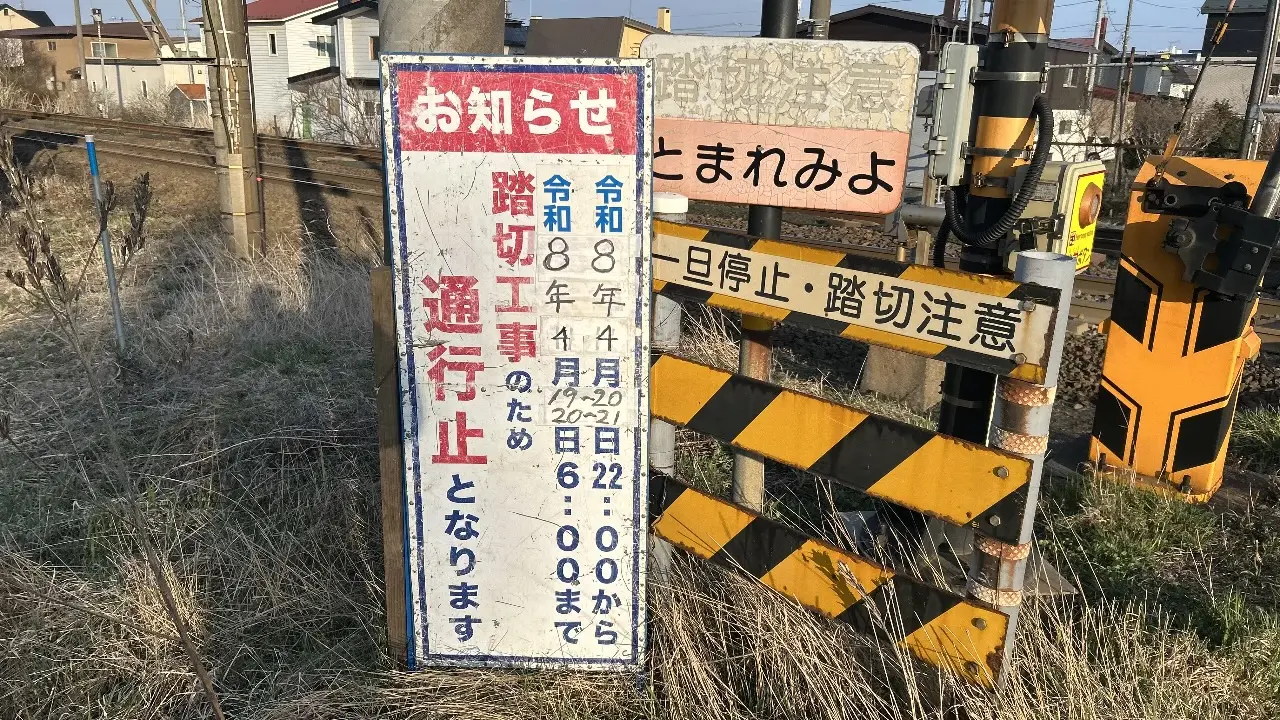 JR室蘭線の糸井駅〜錦岡駅間にある「新通り踏切」で工事が行われるため、2026年4月19日(日)より夜間通行止めとなります。