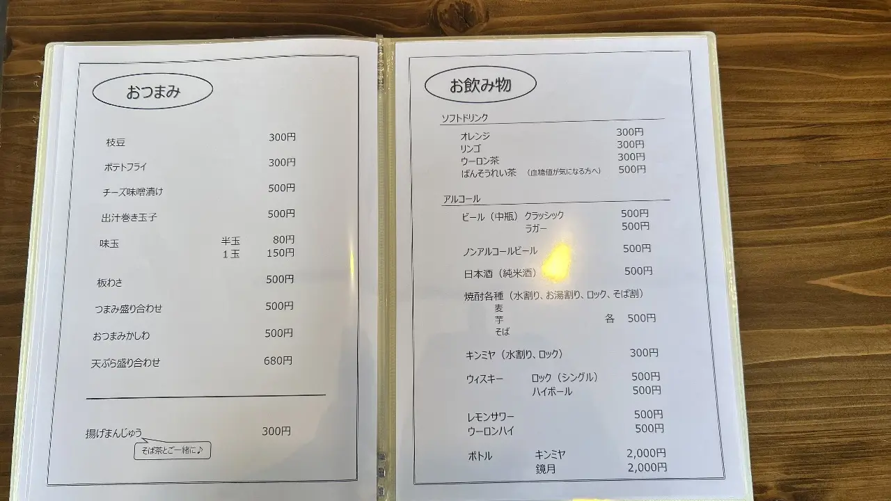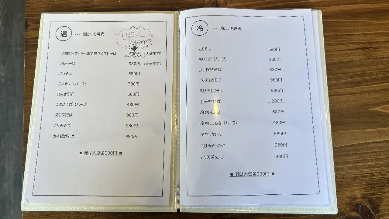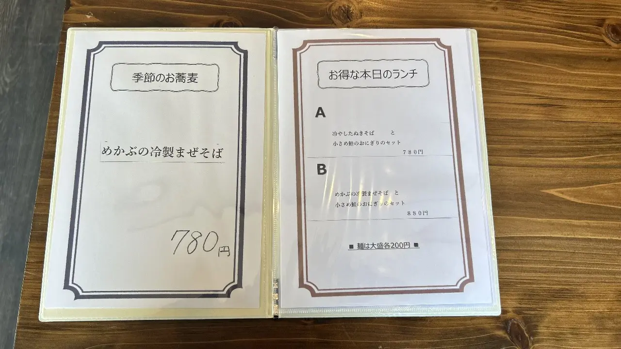 メニュー表です。蕎麦やランチも非常にリーズナブルに楽しめるのが大きな特徴です。