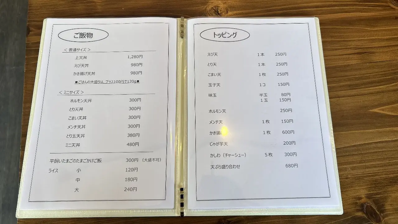 天丼といったご飯ものやトッピングも充実しています。