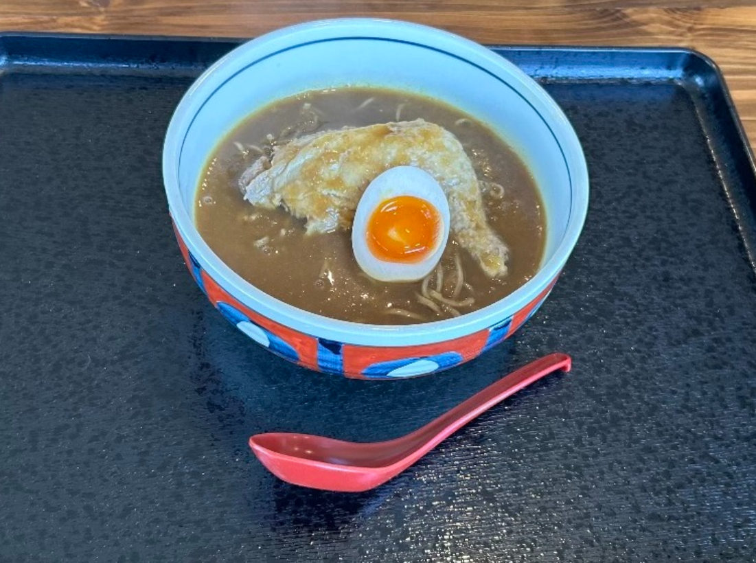もう一品は「カレーそば(税込980円)」です。柔らかいチキンとゆで卵が乗ったカレーそばはまるでスープカレーのようなコクと風味を感じます。