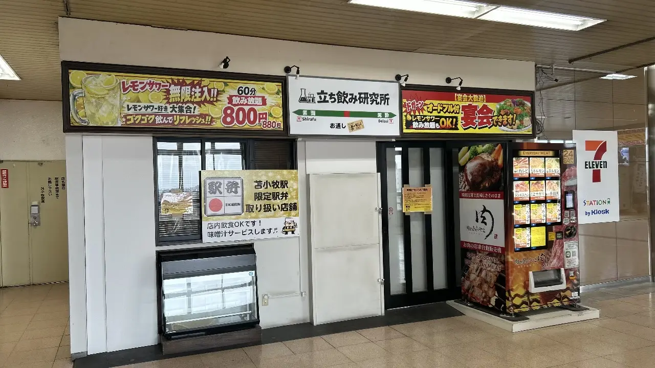 表町にあるJR苫小牧駅構内で、新たな動きを発見しました。駅構内のテナントに、「立ち飲み研究所」と書かれた看板が設置されているのを確認しました。