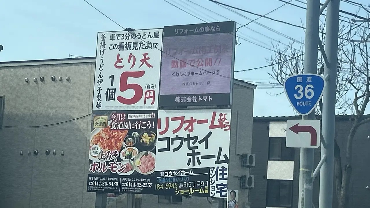 国道36号線沿いで見かけた看板。なんと「とり天1個5円」という表記があり、思わず目を引きます。気になったので実際に注文してみました。