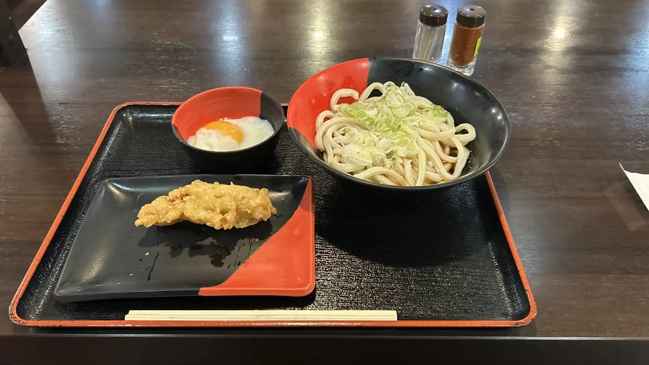 こちらが「かけうどん(税込410円)」と卵のトッピング、さらにはとり天も注文しました。