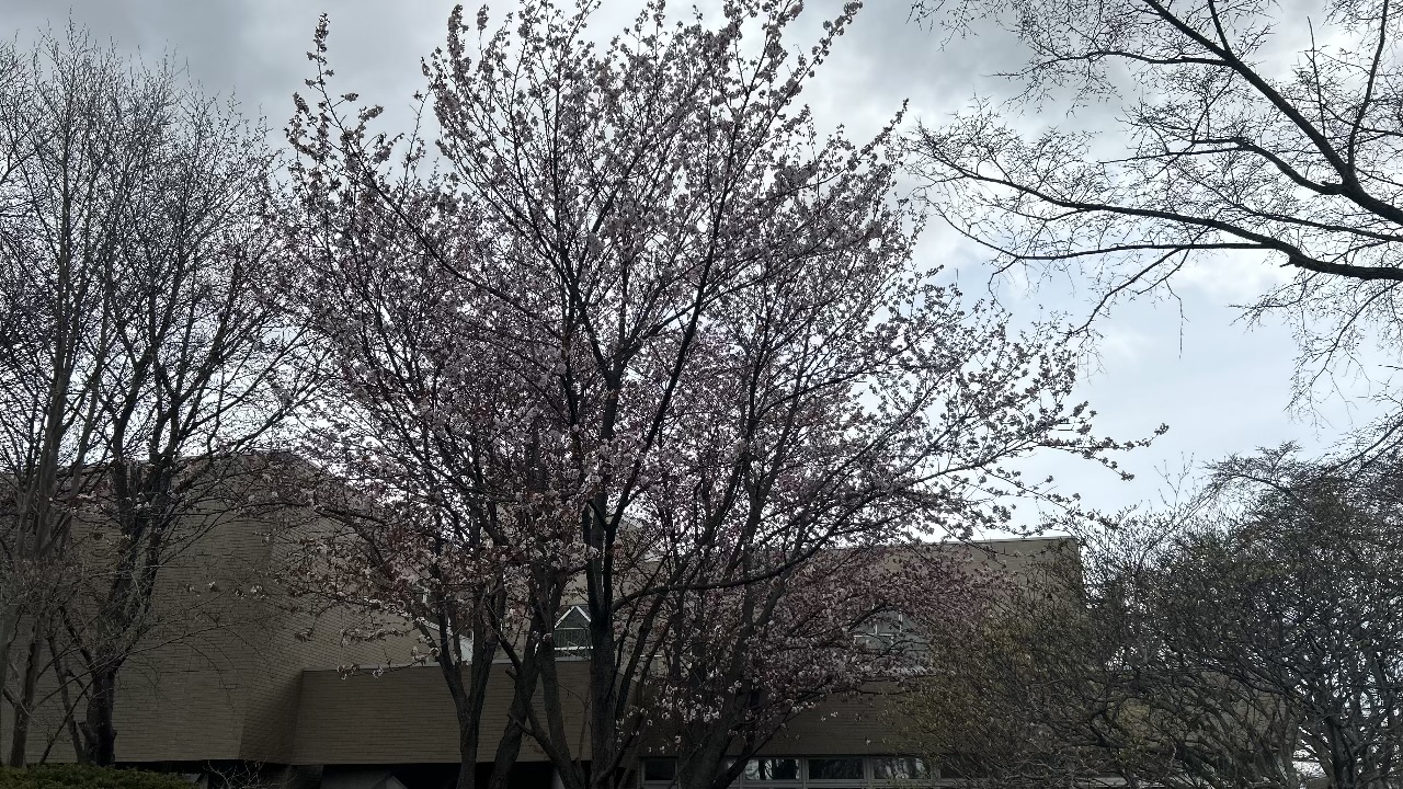 また、中央図書館横の桜は満開近く咲いている様子でした。